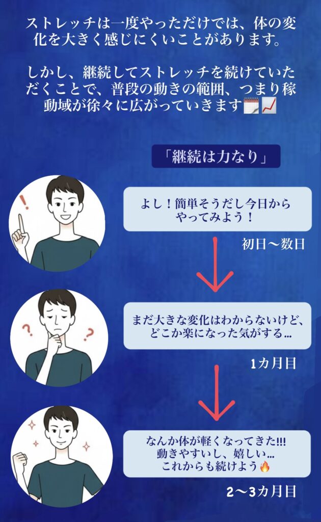 しかし、継続してストレッチを続けていただくことで、普段の動きの範囲─つまり「稼動域」が徐々に広がっていきます!