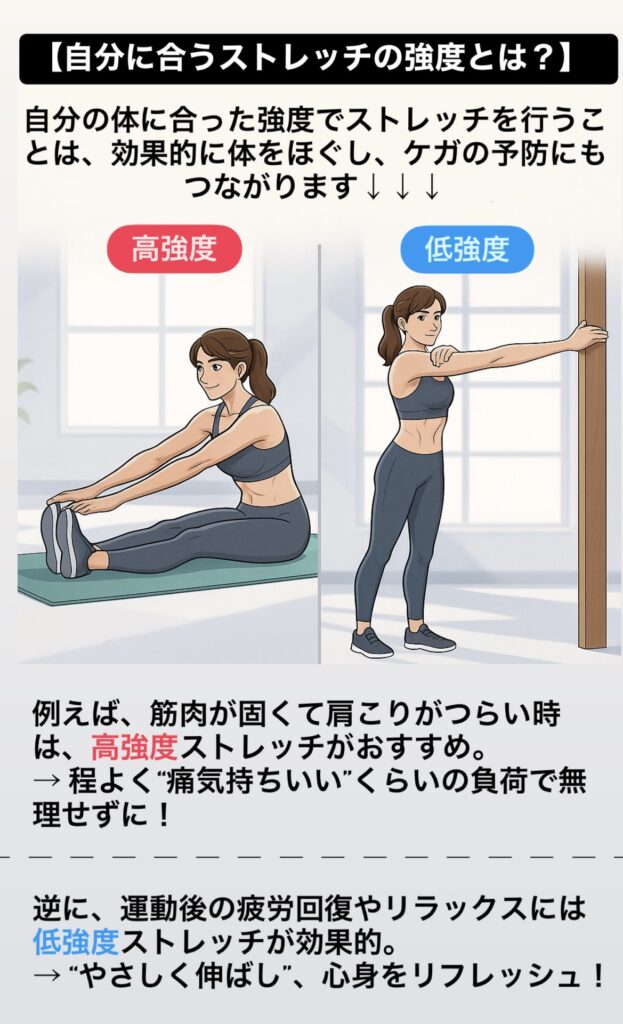 反対に、運動後の休養やリラックスを重視する時は、“ソフトで弱め”の低強度ストレッチが効果的です!