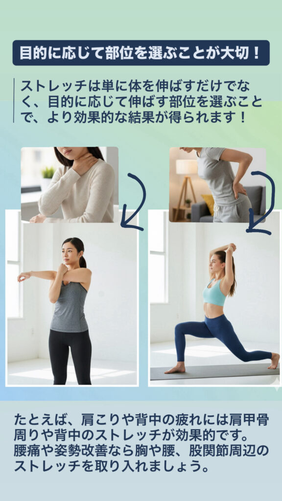 ストレッチは単に体を伸ばすだけでなく、目的に応じて伸ばす部位を選ぶことで、より効果的な結果が得られます。たとえば、肩こりや背中の疲れには肩甲骨周りや背中のストレッチが効果的です。