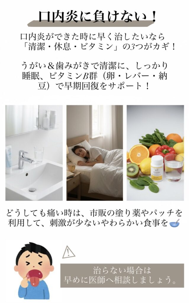 毎日の歯磨き・うがいで口の中を清潔に─しっかり寝て体を休めて、ビタミンB群豊富な食品(卵・レバー・納豆など)を意識しましょう。